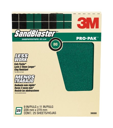 3M SandBlaster Pro-Pak Paint Stripping Sandpaper 30080ES-5-B, 80 Grit, 9-Inch x 11-Inch, 25/pk, Open Stock. Make your sanding projects LESS WORK with 3M SandBlaster high performance abrasives. Use this 80-grit (coarse) sandpaper to feather or blend the edges of chipping finishes like old paint, clear coats, and even rust. The sharp, synthetic minerals cut fast, stay sharp, and resist clogging, which extends the sanding life of each sheet. For optimal reults, be sure to sand with the grain of the wood and work through a sanding sequence, from coarse to very fine, skipping no more than one grit between stages. Use the color-coded package and sandpaper to select the right sandpaper for each stage of sanding. The colored abrasive will NOT discolor the surface you are sanding. Sheets of sandpaper can be used by hand, on a sanding block, or cut it to size for a power tool sander.This website is a participant in the Amazon Services LLC Associates Program, an affiliate advertising program designed to provide a means for sites to earn advertising fees by advertising and linking to amazon.com